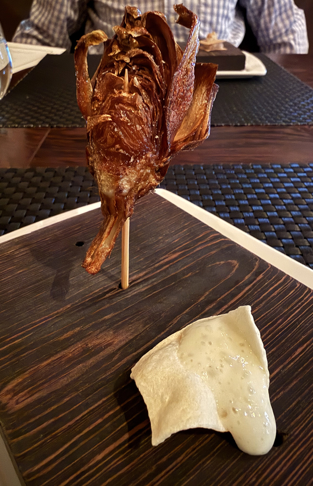 For my next round of canapes, I enjoyed a thin-as-can-be potato chip covered in potato mousseline. Yes, potato on potato action to amplify the earthy taste of the spud. There was also an artichoke heart, fried to a crisp that also ate nearly like a potato chip, too.