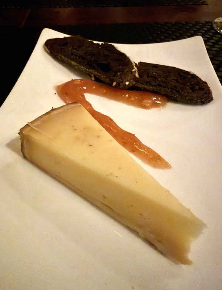 The cheese course is identical for both menus: a wedge of Tomme Crayeuse, a buttery, nutting tasting cow’s milk cheese from France that is garnished with pumpernickle toasts, and a sweet-tart Asian pear-grapefruit sauce.