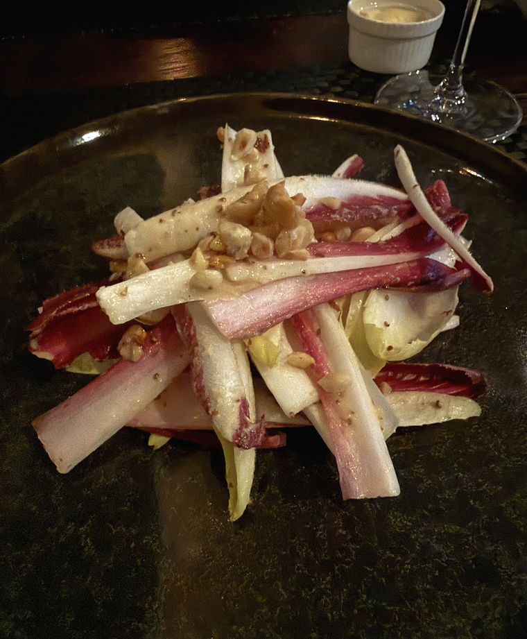 A bubbly Champagne Pierre Moncuit Grand Crus with high minerality complemented my crisp, cold, red endive salad tossed in a hazelnut oil vinaigrette and strewn with toasted hazelnuts.