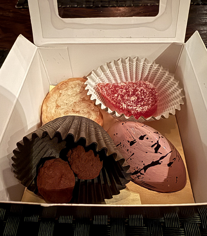 Knowing that most diners are full at this point, the mignardises arrive at the table already neatly boxed up to take with you. There’s pate de fruit, a tiny palmier, and chocolates.