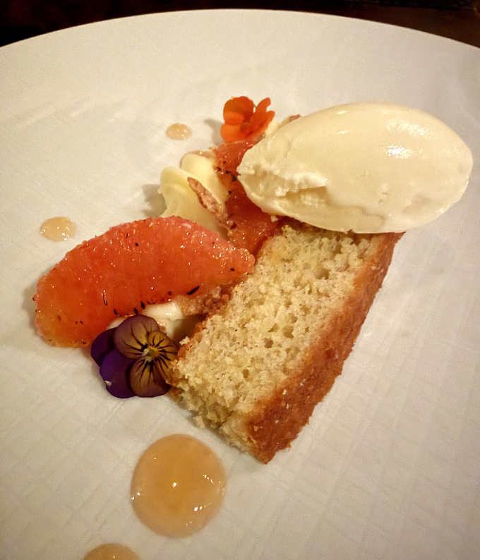 For dessert, I was served a lush olive oil cake with fanciful supremes of grapefruit that had been sugared and torched like creme brulee. The final touch was spruce tip ice cream that evoked hiking through a forest.