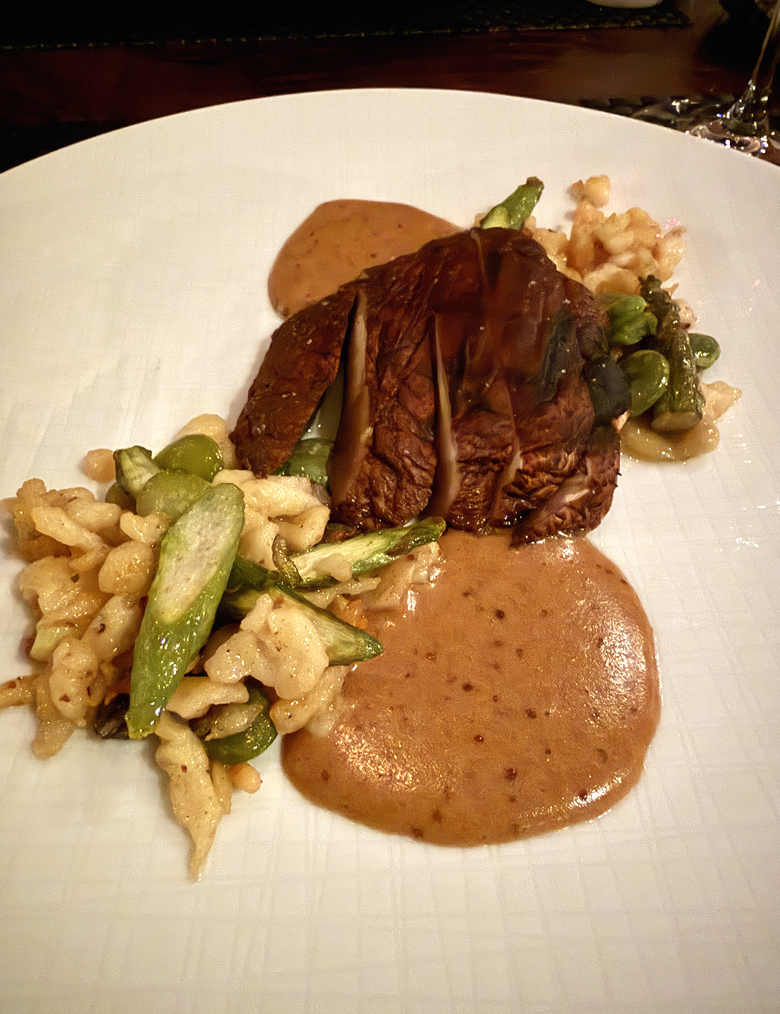 A grilled portobello mushroom steak might not be ground-breaking on a vegetarian menu. But there’s no denying that when it’s done well, as it is here, it’s deeply satisfying for its meaty texture and deep smoky flavor, not to mention an umami bomb of a black garlic Bernaise that came with it. The accompanying spaetzle was nicely chewy-tender, and sported those wonderful pan-crisped edges.