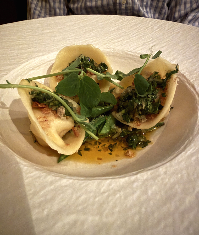 My husband’s “soup tortellini” was a play on Chinese xiao long bao. Even though it’s a bit on the larger size, you’re instructed to eat it in one bite, lest you end up squirting yourself or your dining companion when you hit the very juicy rabbit filling. The Italian-meets-Chinese influence continues in the Calabrian chili crisp that’s drizzled overtop, a fun finishing touch that provides a little fruity heat.