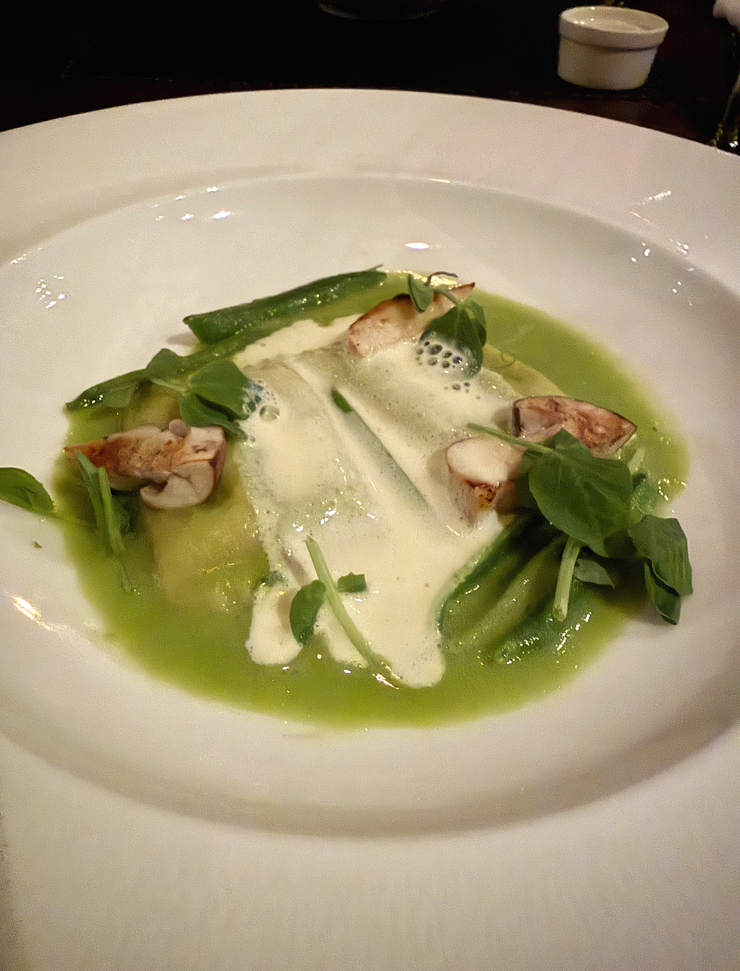 For the pasta course, my dish was supple ravioli doppio, filled with a mixture of stinging nettles and porcini, strewn with sugar snap peas, and topped with a milky, tangy Robiolina espuma.
