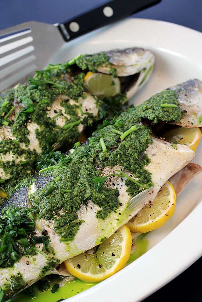 Whole Roasted Snapper (or Branzino) with Green Anchovy Butter