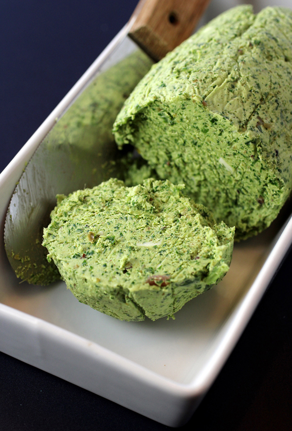 Place all of the ingredients in a food processor and blend until well combined. Spoon the butter onto a piece of parchment paper and roll into a tight log. Store in the refrigerator for several weeks.
