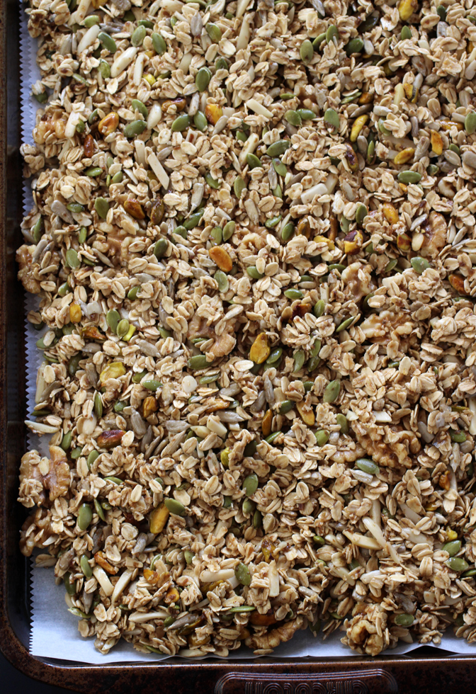 Mix the syrup and some oil with a heap of oats, almonds, walnuts, sunflower seeds, and pumpkin seeds. Because granola is so adaptable, I also threw in a big handful of pistachios that I had on hand. So, feel free to add your own personal favorites.