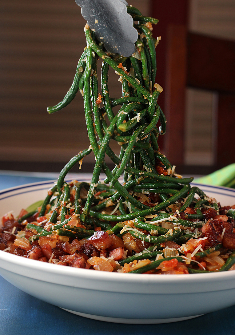 Using Chinese long beans, otherwise known as yard beans or snake beans, in place of bucatini might seem virtuous and the ultimate no-carb, gluten-free hack. But in the hands of Chef Jeremy Fox, it is decidedly decadent, loaded with crispy guanciale, and finished with butter.