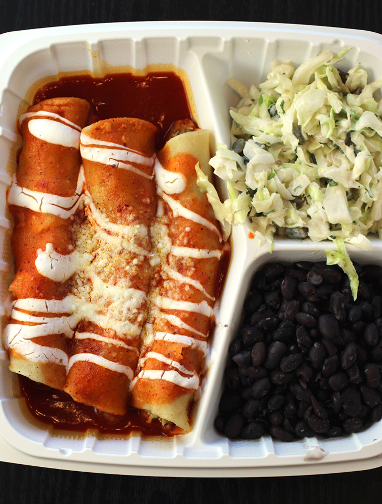 The Cuban pork enchiladas ($12.49) come three to an order, along with black beans and crunchy, mild tasting Aqui slaw. The enchiladas are filled with ground pork that’s been cooked with mashed plaintains, giving it a nice sweetness, before being napped with a red, nutty tasting achiote sauce. Squiggles of sour cream decorate the top.