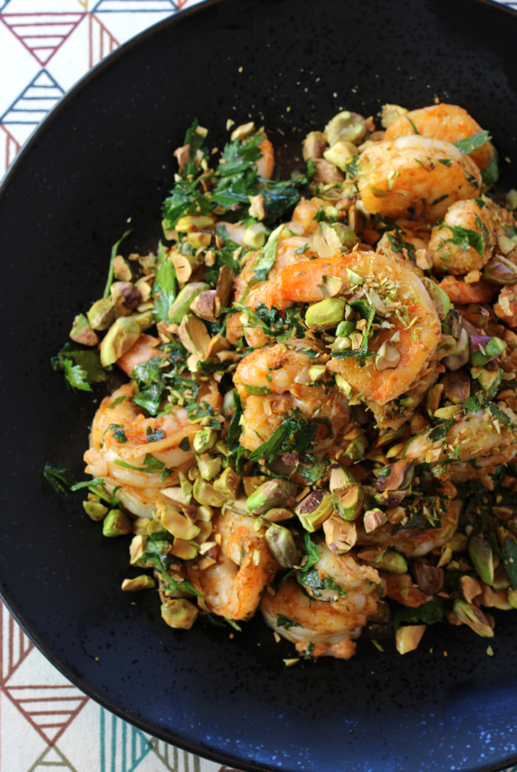 “Pan-Seared Shrimp with Pistachio, Cumin, and Parsley” presents an intriguing method: You first place all the shrimp in one layer in a nonstick pan on top of the stove. And then, and only then, do you turn on the burner to high.