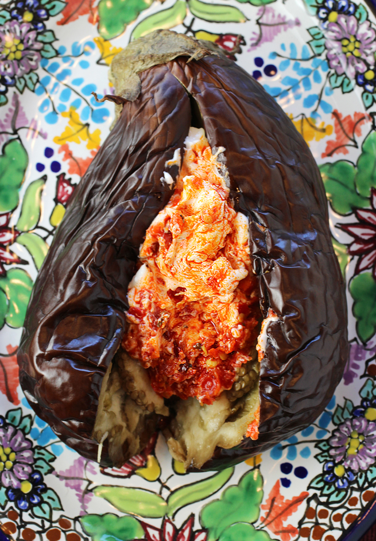 Creamy roasted eggplant gets dressed with yogurt and Calabrian chili.