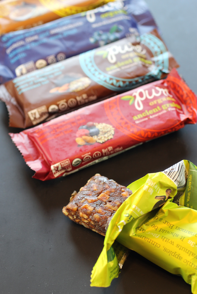 Pure Organic bars don’t contain gluten, dairy, soy or GMOs. The Fruit and Nut Bars weigh in at 200 calories or less, and contain 5 to 6 grams of protein and 3 to 4 grams of fiber. They are barely sweet and have a dense, chewy, fruitcake-like texture. The Apple Cinnamon one is like a taste of apple pie, only a whole lot less sugary.