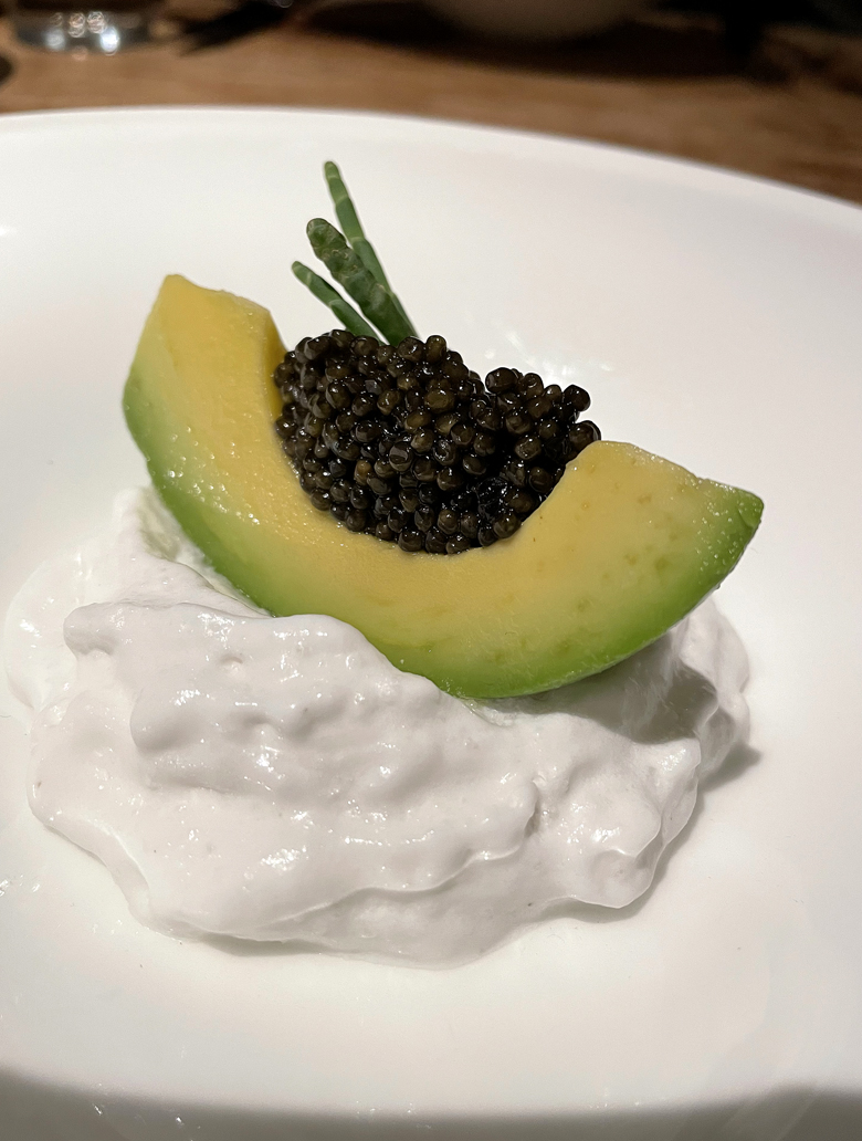 Avocado stuffed with caviar and atop a cloud of coconut at 1601 Bar & Kitchen.