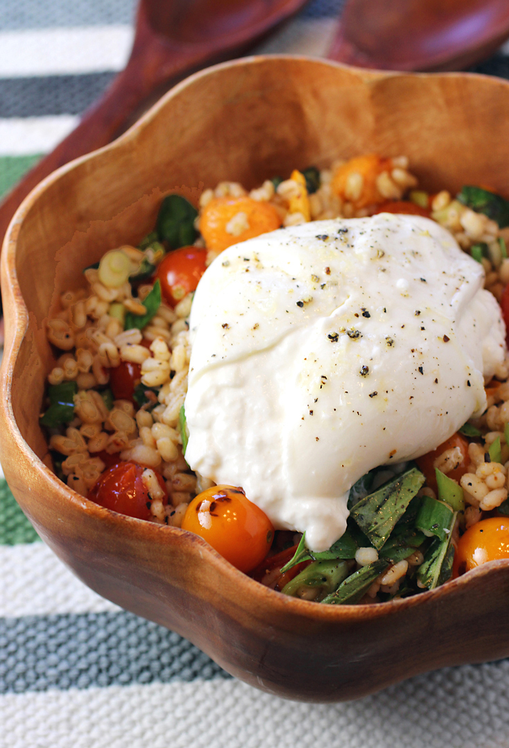 With its luxurious cream center that spills out of a ball of mozzarella, burrata is one of my favorite cheeses. So I just had to take a go at “Smoked Barley with Blistered Tomatoes & Burrata.”
