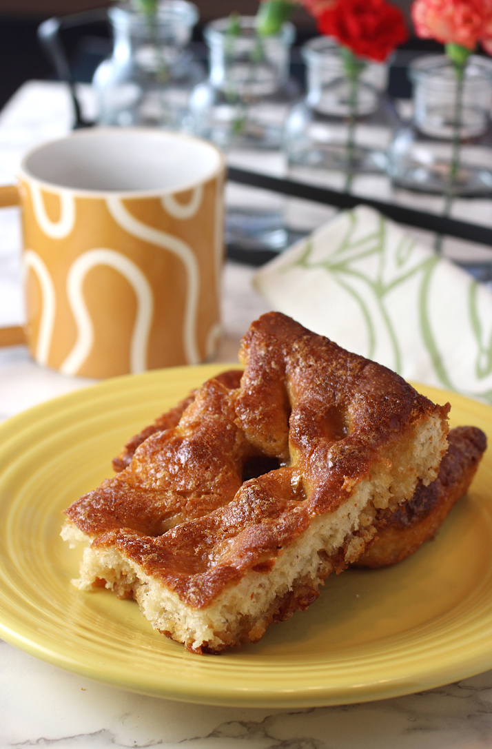 It looks exactly like focaccia with its dimpled top, which creates perfect crevices to hold the buttery, sweet syrup that gets poured over its entire surface before baking.