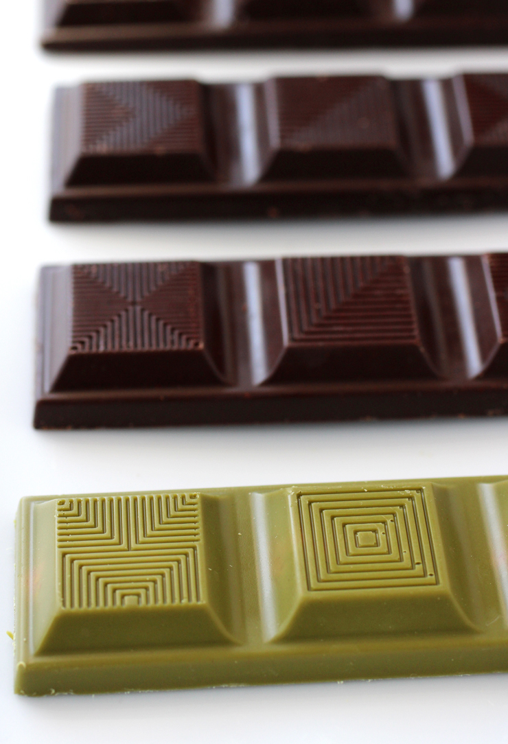 TCHO chocolate bars (front to back): The Perfect Matcha, Grizzly Berry, Deep, Dark & Salty, and Hoppy Hour.